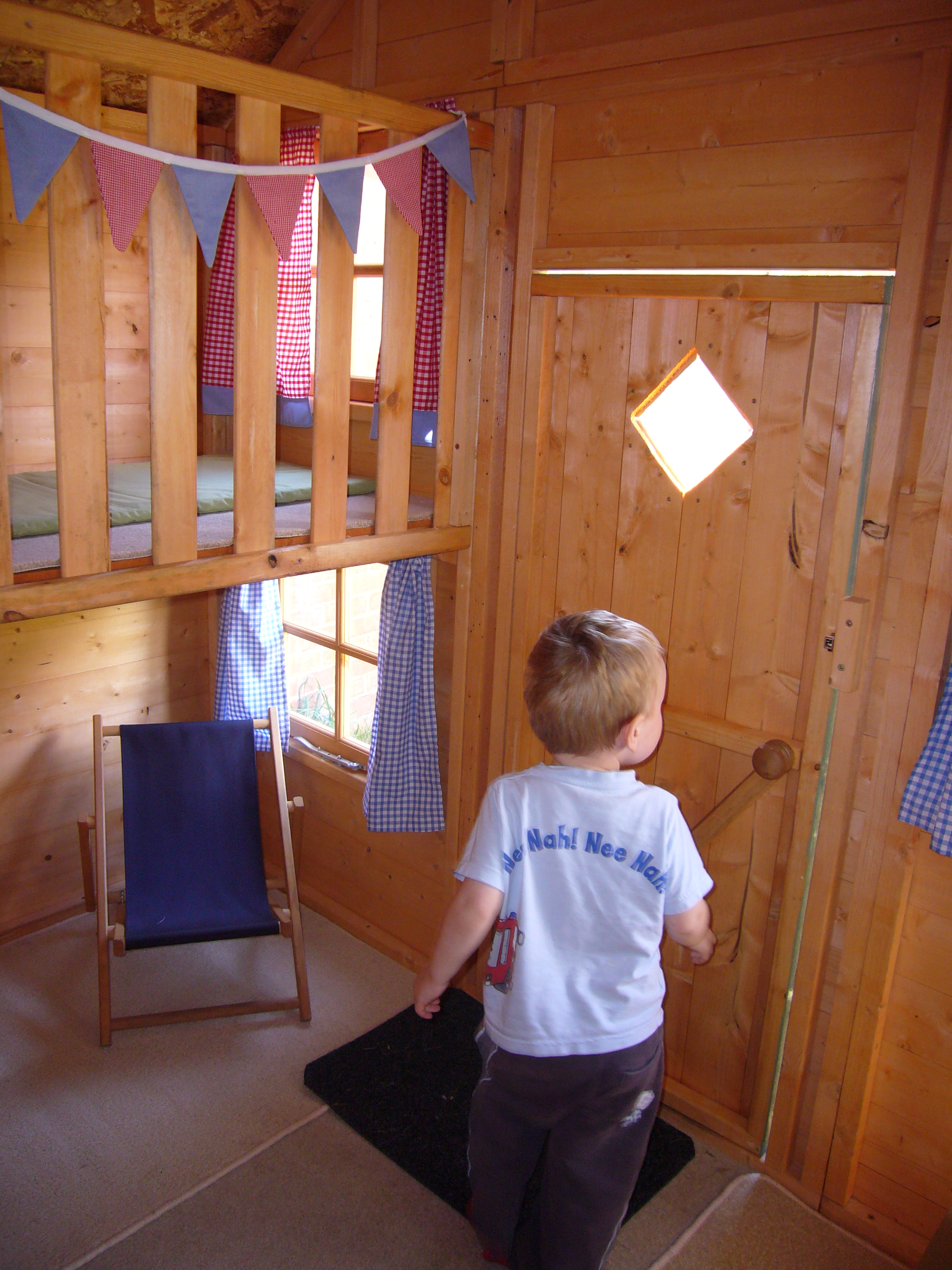 My sewing machine and I have been hard at work making 4 pairs of gingham curtains, a red gingham table cloth complete with 4 chambray napkins, a tea towel made from Cath Kidston blue spot fabric to match Mummy's, 2 mini cushions with covers made from Disney 'Cars' fabric and a matching bag made from the spare fabric in which to carry the 'cars' when out and about. PLUS I've added Hearts & Flowers labels to 2 mini hand towels as hanging loops. Not to end there...the upstairs level has been carpeted (thanks Janet for the carpet) and the downstairs has both mats and carpet so it's lovely and soft for the boys to sit on and play. I added mini bunting which I had made a while back and hung this from the balistrade and made the upstairs 'bedroom' curtains to match. Yesterday I hung up 2 sets of battery powered fairy lights (from our Christmas box) inside for extra cuteness when they pretend it's 'night-time' and draw the curtains. The playhouse should be complete by the end of this weekend because I'm going to Ikea with my friend Sara to buy a little table and chairs. Yes, I may be going a little over the top with cute handmade accessories, BUT I am loving being able to make all of these things for my little boys AND hopefully they will enjoy playing with them for years to come!