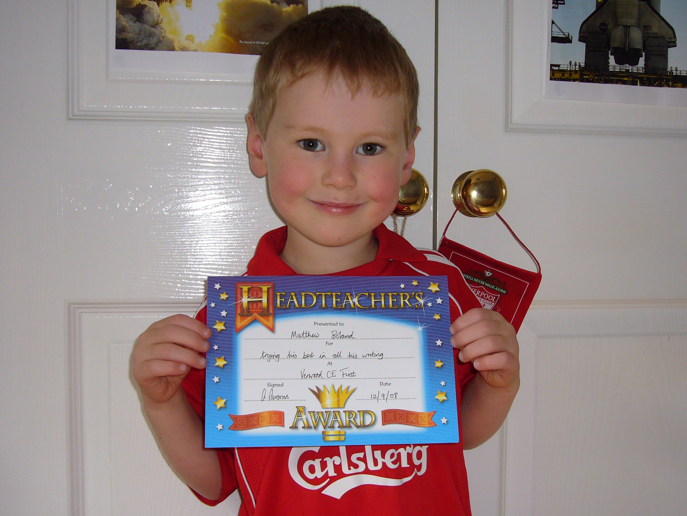 Matthew received a Headteachers Award last Friday in assembly for 'Trying his best in all his writing'. Two children from each year receive an award every friday, there are 60 children in his year. He had his picture taken with the other seven children and it will be on display in the school foyer for the next week - must remember to go in and see it.