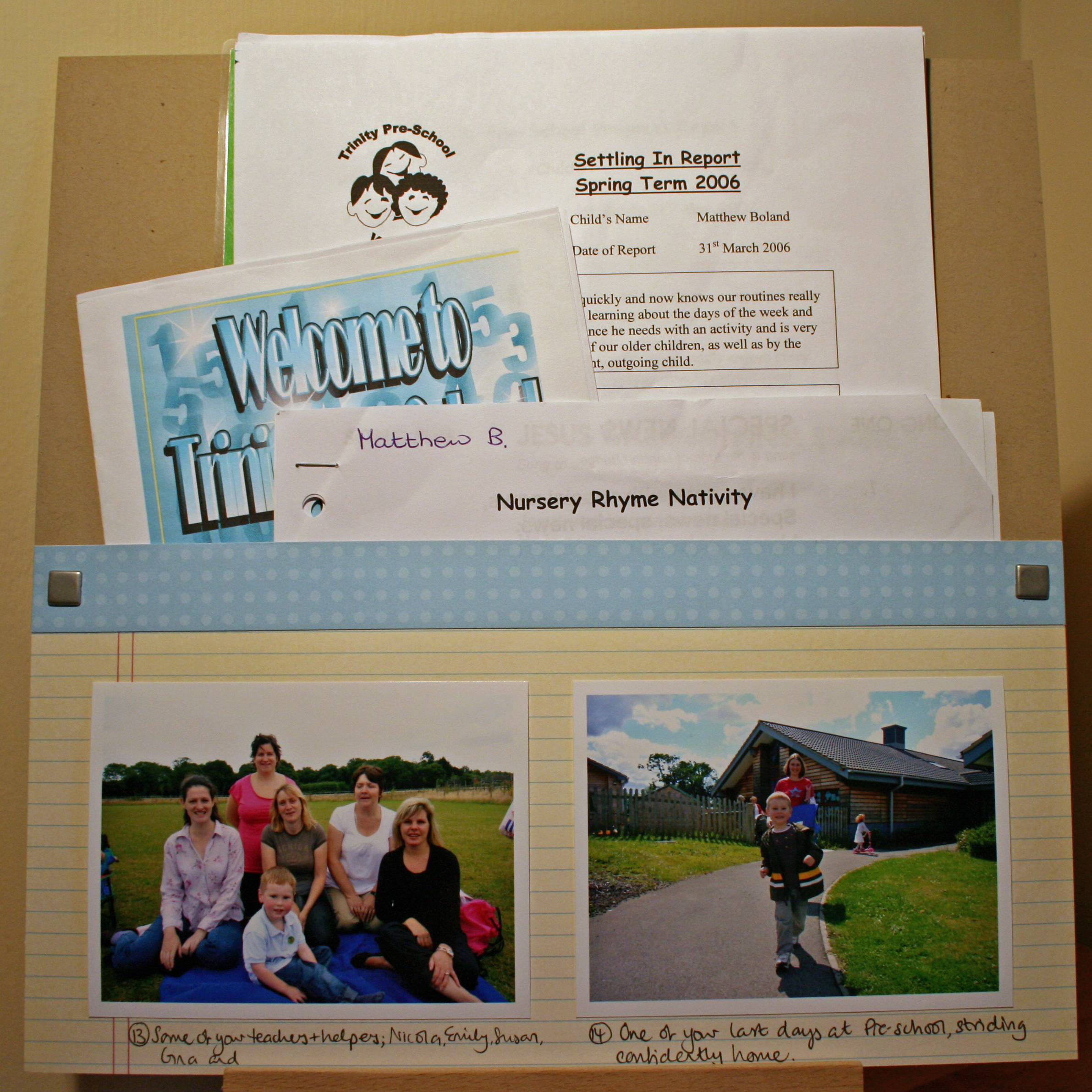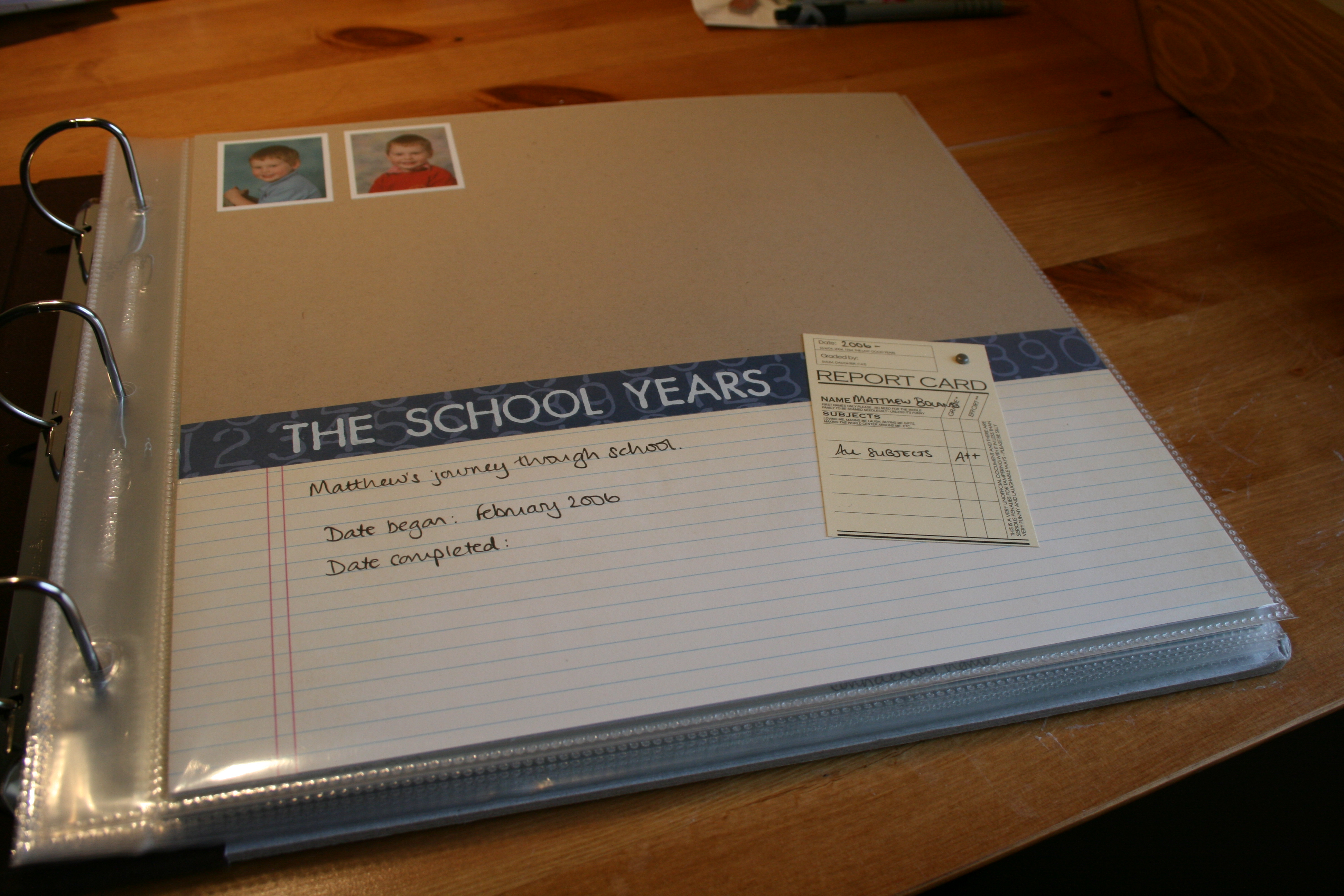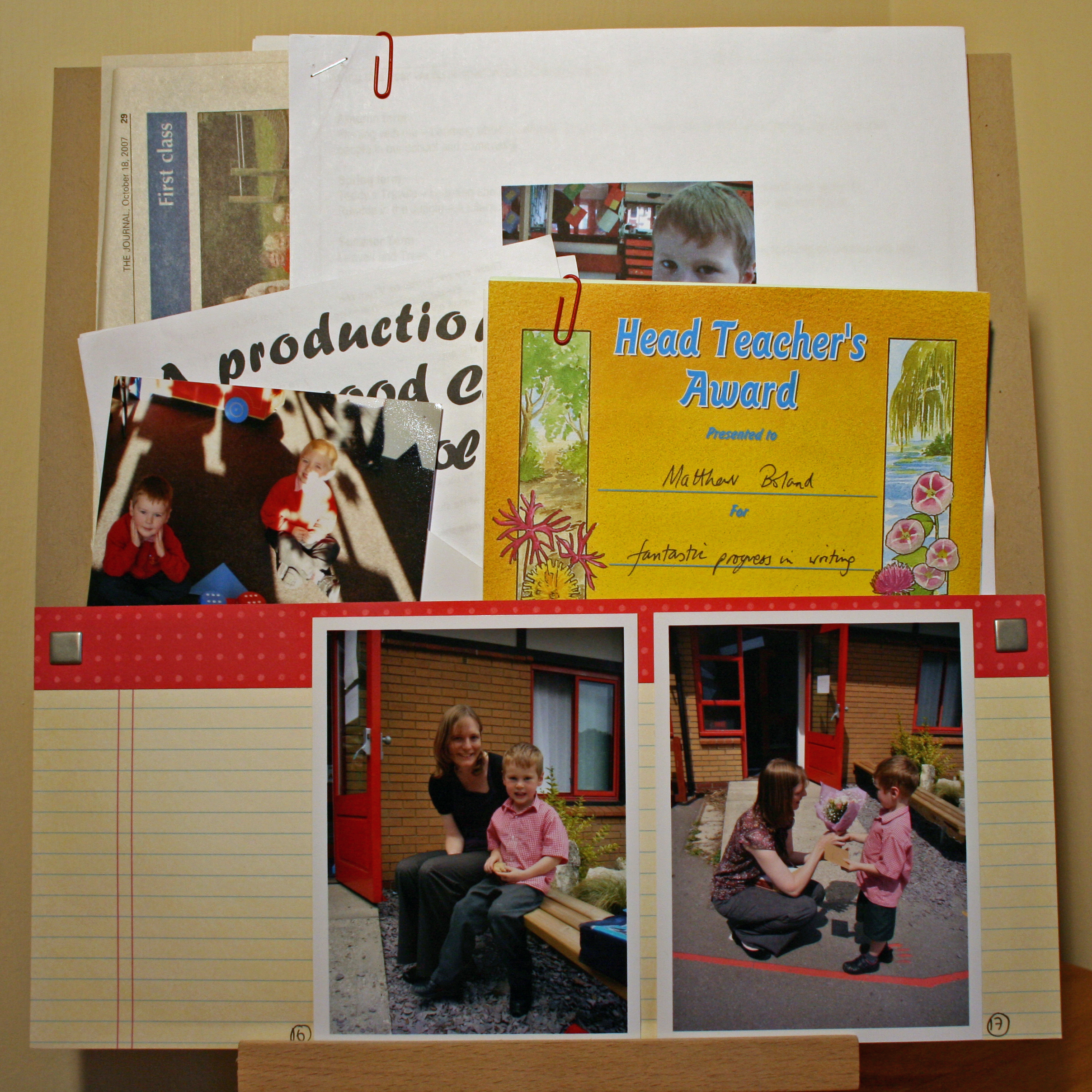 2. A 12 x 12 Album - 'The School Years' for Matthew. For those of you who are into scrapping you may have seen this idea in Cathy Zielske 'Sequel' book, and she in turn had taken it from Stacey Julian. For those of you who aren't; basically the idea is to make 4 pages for each year of your child's school life, which you complete just once a year. Here's what's in Matthew's so far; pre-school and reception. I have bought enough Scenic Route lined paper for the 15 years that he will be in education (up to A-levels) so that I can maintain the scheme. The only thing that will change will be the accent strip of patterned paper on each page, which I plan to match to his uniform. Blue spot (KI Memories) for pre-school and red spot (Scenic Route) for his first school. Also added 7gypsies report cards just because they look so cute!