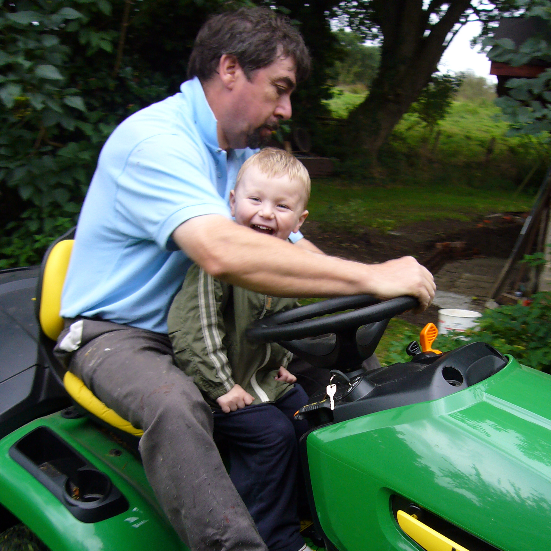 And unrelated to the number 4 or word 'fore' some very important news. Callum had his regular hospital appointment to check on his eczema, he had recently had quite a bad flare up so I again asked if we could get some allergy tests done. To my surprise she said 'yes', I had asked for this last year and for some reason they wouldn't do it. Anyway, that same afternoon Callum had some blood taken which they will test for a number of things; dairy, nuts, cats, dogs, house dust, house dust mites, grass and tree pollen, plus some others. We should get the results back next week, it will mean so much to us to know which of the things we suspect are causing his eczema (and possibly his asthma) are and which aren't. Here's a photo of him with Grandad, my Dad helping to do the mowing last Thursday - check out that excited face!
