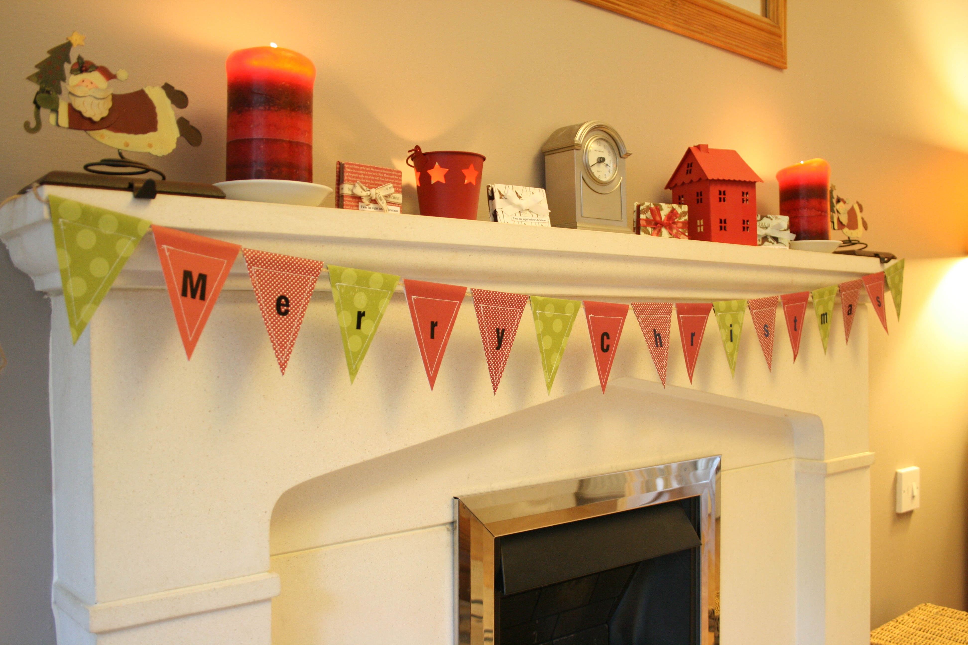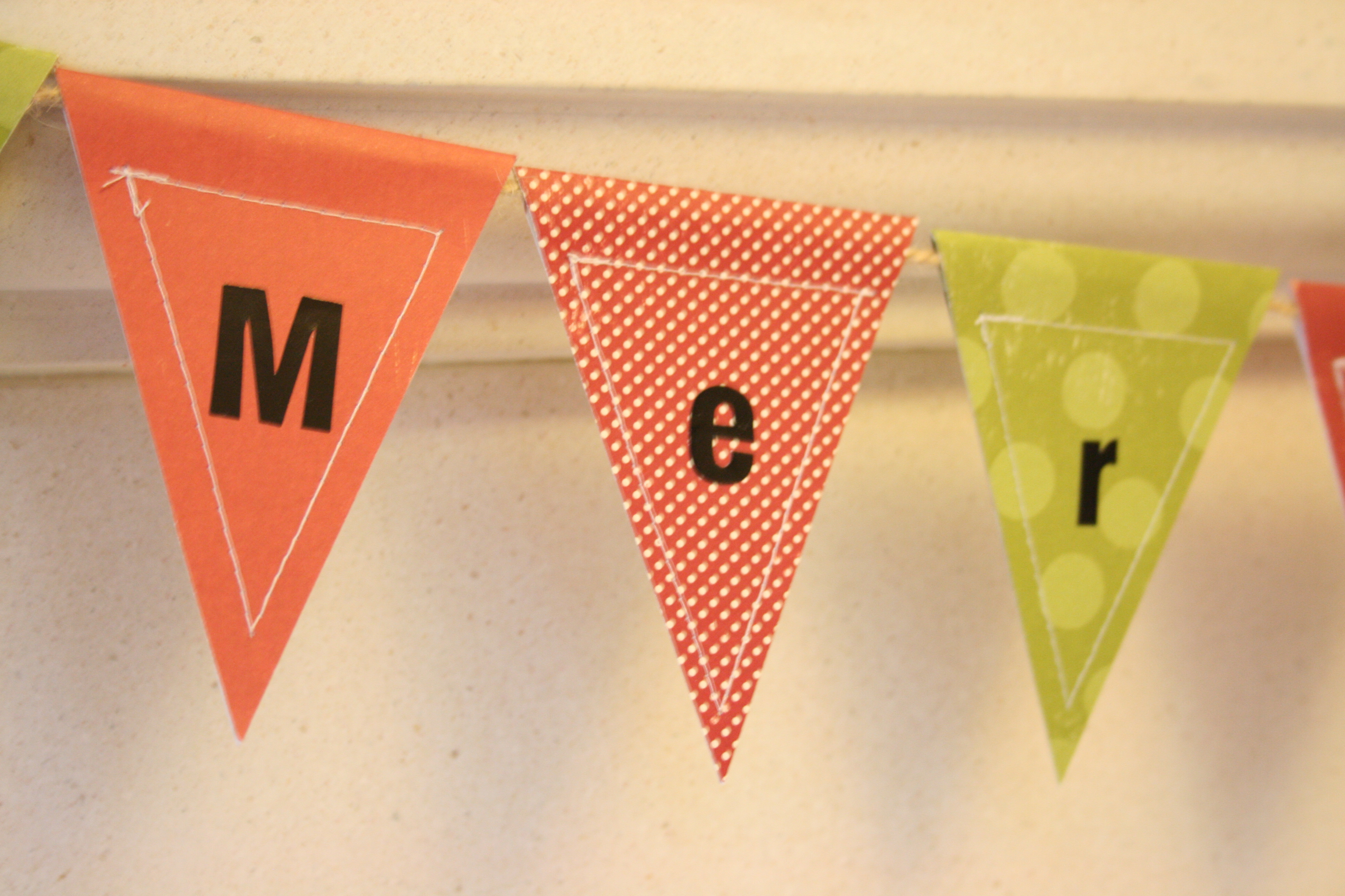 Paper 'Merry Christmas' Bunting, stitched around edges (paper has been folded over) and threaded onto twine. Paper by Making Memories and letter stickers by American Crafts I also have a single-sided version which has the letters stamped in black and twine threaded through black eyelets on the top edge. I'm definitely keeping one of these too!