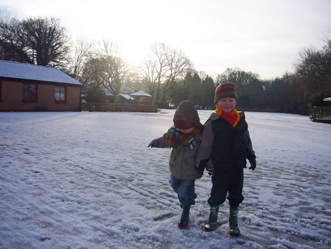 Today school was open and after what seemed like an age to get the boys dressed in appropriate winter clothing including welly boots, plus remembering to take shoes too, we left the house - late. Driving the car wasn't as bad as I thought, the snow had turned to slush for the most part and the temperature was above freezing so not too icy. I took my camera with me and we were greeted by this beautiful scene of the playground and the playing field beyond. The snow under foot gave a lovely crunchy sound when we walked on it and wasn't very slippy.