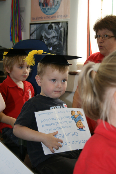 After the sports day, the parents were allowed to stay and eat lunch with the kids on the school field. Very handy because 20 minutes later I had to take Callum to Pre-school for the very last time (Pre-school is just across the playground). Callum was having a special 'Graduation' ceremony later in the afternoon, which gave me about an hour to rush into nearby Ringwood to buy bits and pieces for his 4th birthday party before I had to return. I wasn't sure what to expect from a pre-school graduation ceremony, but it was lovely. They performed several songs which actions. I was very proud of him. Then they were all awarded a certificate and a mortar board to wear. The mortar boards had been handmade by the play leader using a square of black card, a black plastic bowl, wool tassle and a brad. They were brilliant, the kids looked so cute.