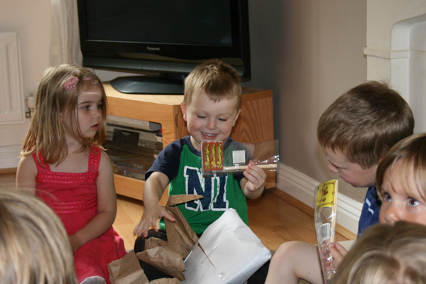 I found some sandcastle flags in our local toy shop (Callum's got them in his hand below), just the same as I remembered playing with on the beach when I was young. I bought all the stock the shop had left, which wasn't enough to fill 12 party bags, but enough to alternate with little colourful rubbers in pass-the-parcel.