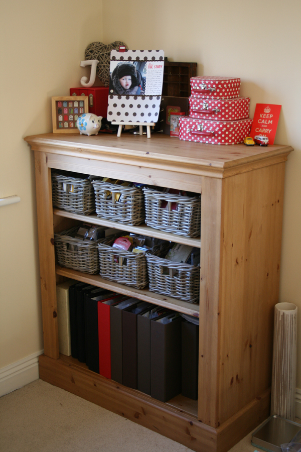 Behind my desk sits my lovely deep bookcase (given to me for Mothers Day a few years a go). I bought eight lovely little baskets (Byholma) - two are used as drawers in the units under the desk and the other six are in the bookcase. I really wanted to have everything looking neat and matching, and I'm really pleased with how it has all come together. In the baskets I have my; paints, punches, scrap patterned paper/cardstock, journaling spots/cards/etc, chipboard embellishments and other embellishments. The bottom holds my scrapbook albums, mainly American Crafts 12 x 12 D-ring albums. Those lovely red polka dot suitcases (given to me by Jeff for Christmas 2008) contain completed mini-albums.