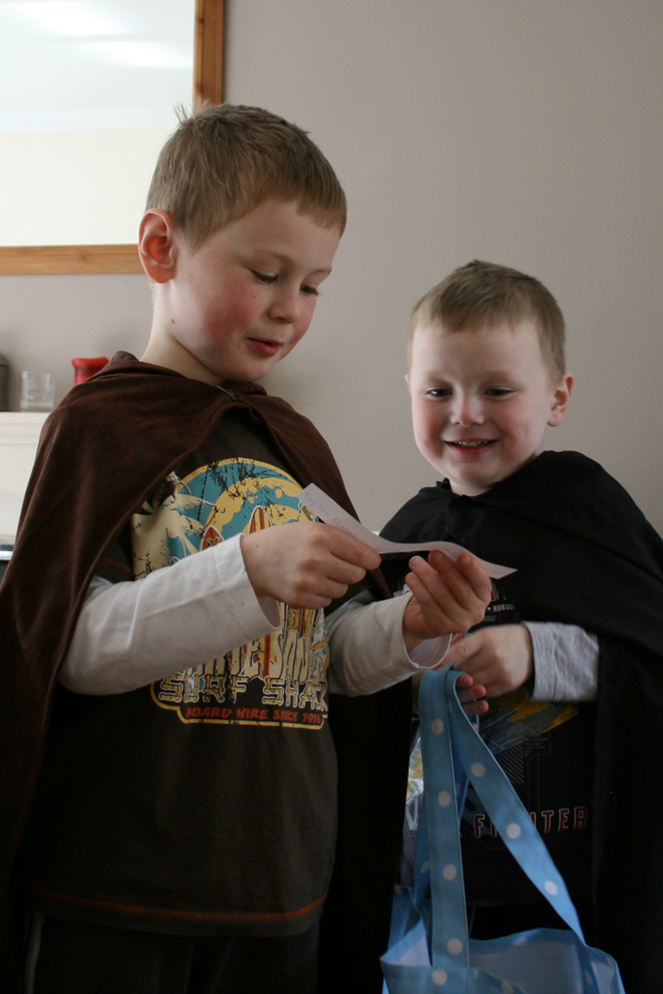 In the afternoon my parents came over and we got the Easter Egg Hunt underway. This year I hid chocolate eggs around the house and made clues to lead the boys on a treasure hunt. (I used to love making treasure hunts when I was a kid - can you tell?) There were 9 clues in all leading them upstairs and downstairs, into cupboards and under tables. And it was their idea to wear their Star Wars robes!