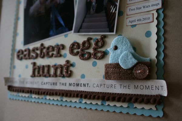 {I used Kraft and a coastal blue (not sure of exact name) cardstock by Bazzill Basics, patterned paper by Lili Bee (one of my favourite pp's), brown pom pom ribbon (American Crafts I think) and digital 'Capture the Moment' twill by Ali Edwards. The brown glittery letters and a little felt bird accent are both from the new Dear Lizzy range by American Crafts - love those glittery thicker stickers. Oh and I used the scallop blade on my Fiskars trimmer to cut the edges of the cardstock and patterned paper}.