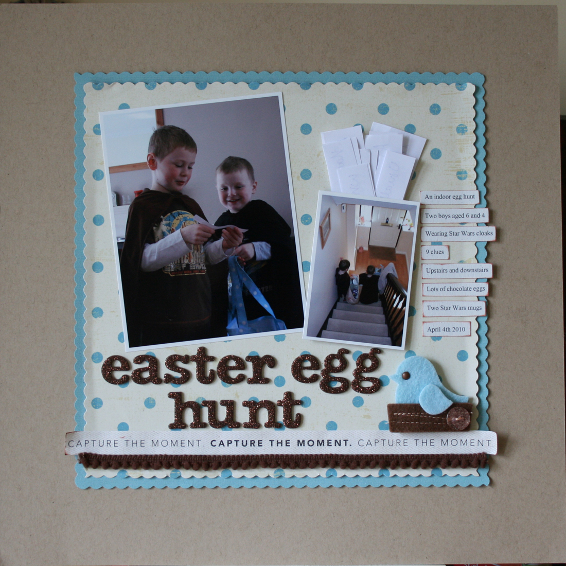 One layout I have made of our Easter is of the boys easter egg hunt. I based it on a design layout on Pencil Lines. I haven't used a Pencil Lines sketch for ages, but I read on Elizabeth Kartchner's blog that she was the guest designer so I thought I'd have a go. (You can see the template on the Pencil Lines blog).