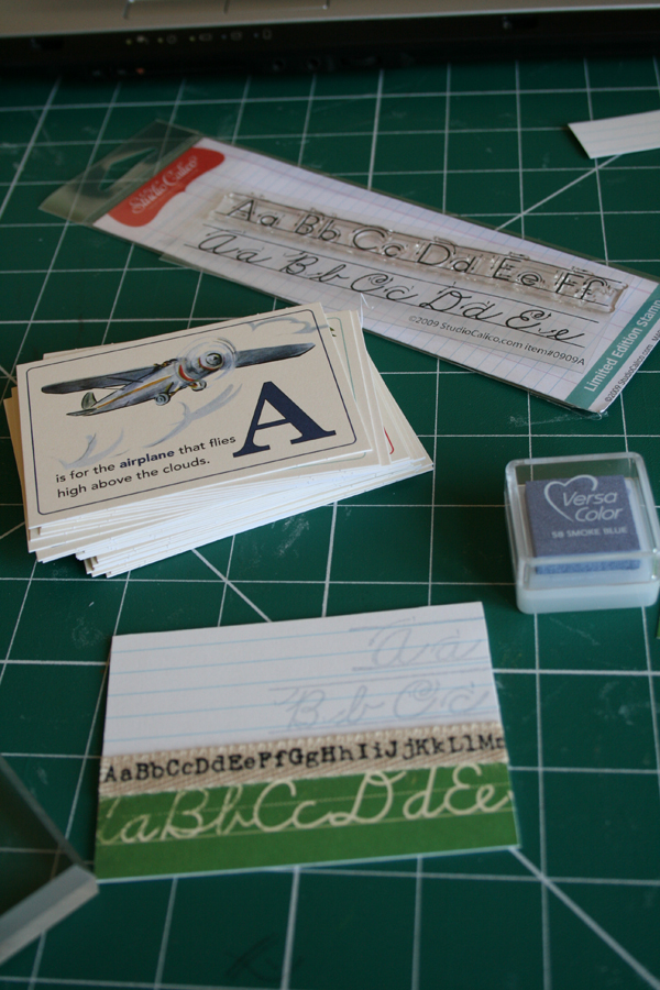 Working on a mini ABC book for Callum. I'm using October Afternoon A to Z cards, Scenic Route and Cosmo Cricket pp, Creative Imaginations twill and a Studio Calico stamp.