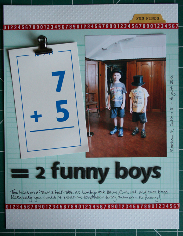 This photo from our holiday in Cornwall was just begging to be scrapped - it makes me laugh. Plus that maths card came from a set I bought in a little shop in Fowey fon holiday for the sole purpose of using on scrapbook layouts. {Supplies - Maths Card - East of India, Dotted Swiss cardstock - Bazzill Basics, PP and Tab Label - October Afternoon, Number Ribbon - KI Memories, Chipboard Letters - Basic Grey, Clip - Tim Holtz}