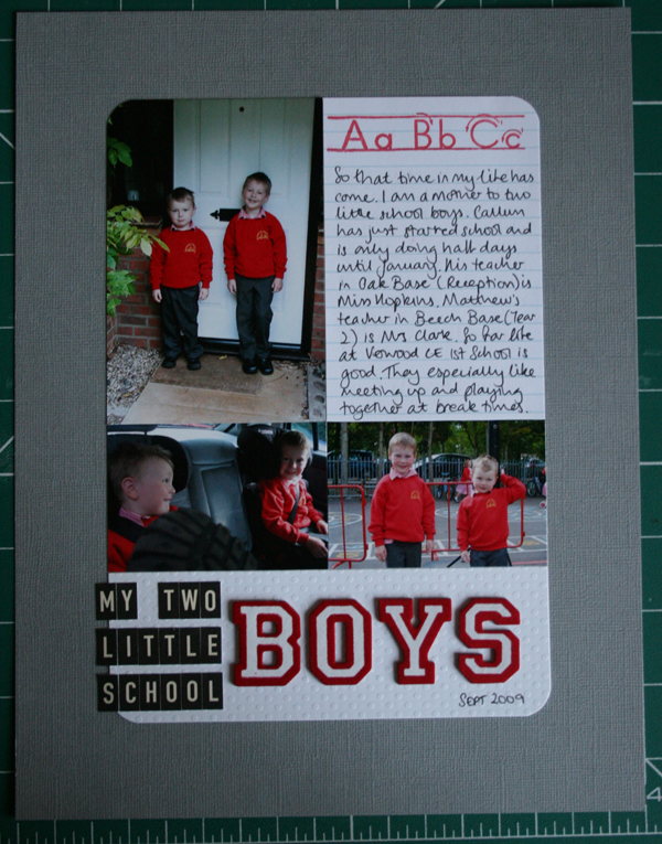 I had planned on doing this layout ages ago, even had the photos printed and the idea in my head. And finally it all come together yesterday. The design is one I've used before in 2008, but originally I scraplifted from a Cathy Zielske layout I had seen in Simple Scrapbooks Magazine - oh how I miss that magazine. {Supplies - Dotted Swiss (offcut from the '= 2 funny boys' layout) - Bazzill Basics, PP - Scenic Route, Large Letter Stickers - American Crafts, Small Letter Stickers - October Afternoon, Stamp - Studio Calico}