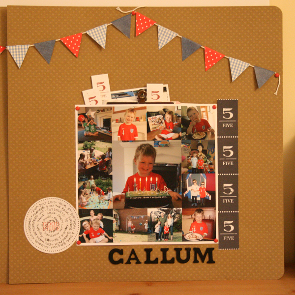 The one below is a double layout I made back in Northern Ireland with my scrap buddies Janine and Sheila. I adapted a layout I saw in BPS Summer Festival by Elizabeth Dillow which had a photo collage and bunting - perfect for the boys birthdays, yes both boys - why invent the wheel I say!