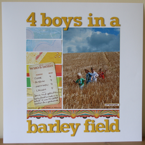 The next layout is about a little photoshoot of the boys in a barley field in Northern Ireland in August with Janine and her boys. I love the photo, had to use it on a layout and when I saw this one by Ali Edwards I thought it would work well with this photo. I used pp and paper strip by Sassafras Lass and Daisy D's, letters by American Crafts, sticker by 7Gypsies and a journaling card by MME.