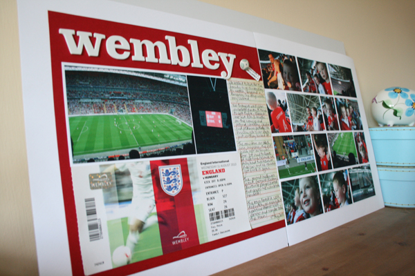 My last layout is about our trip to Wembley with the boys way back at the beginning of the summer holidays. I really like the photo grid but was unsure how to balance it, in the end I cut some red cardstock to the same dimension as the photo collage. I attached my ticket, two more photos, a journaling block (on MME ruled pp), title (American Crafts).