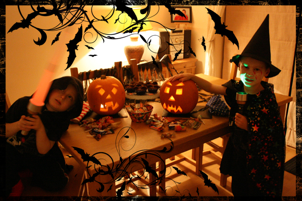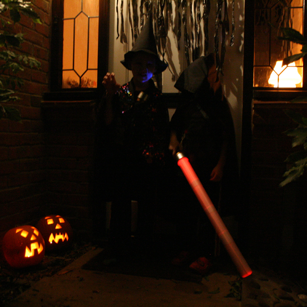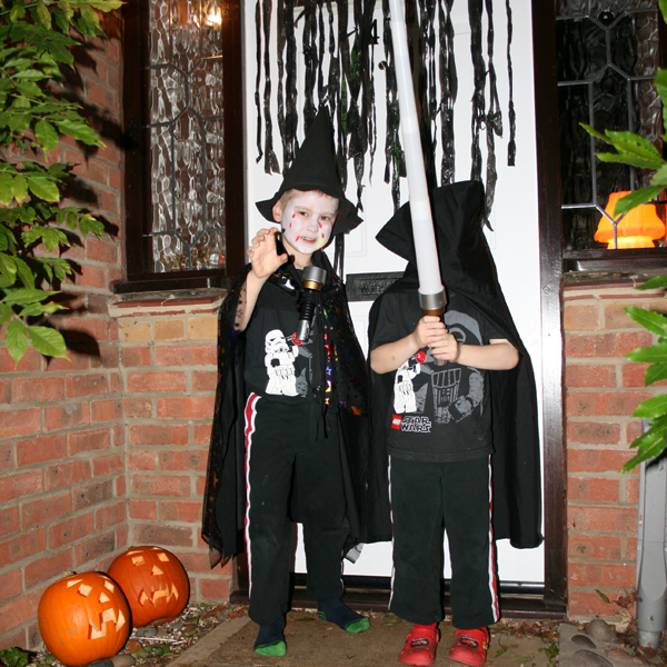 The boys dressed up, Callum as Darth Vader and Matthew as a wizard with a white face, complete with blood. The lightsabers given to the boys by Laura and David at Zacks birthday party came in really handy. Callum kept his lit on red for Darth Vader and Matthew unscrewed the saber part so that the lights would illuminate his face - cool effect!