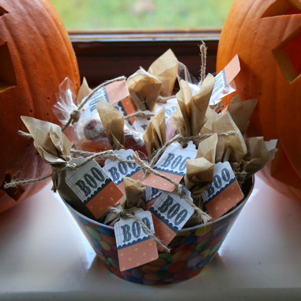 I found a free download for Boo cake toppers on the Click, Write, Scrapbook blog, which I printed and punched out using a tag punch. They made really cute labels for the cones of sweeties I had made up for the Treat or Treaters. Each little brown paper cone contained 4 halloween sweets; chocolate eye balls, chewits fangs and halloween shapes fruit gums.