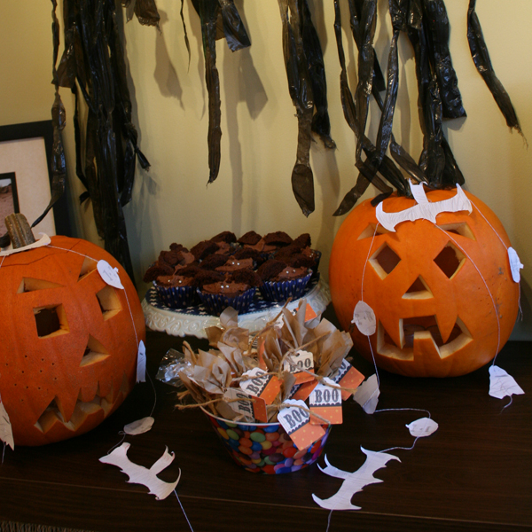 I also found the great idea to decorate the front door made by cutting strips into a black bin bag and stretching them. Matthew and Callum cut and decorated the paper bats, pumpkins and ghosts you see in the third photo, their very own idea. I then sewed them together into a garland which we hung from the hall lights.