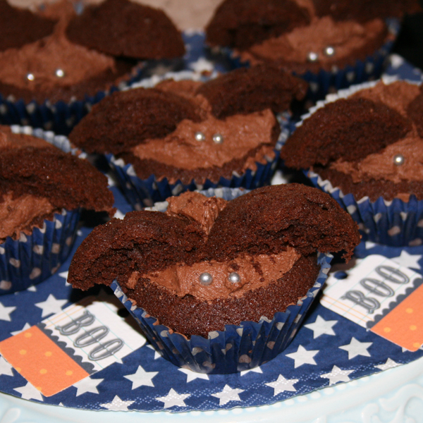 And we made Bat Cupcakes from a simple chocolate cupcake recipe, a Halloween take on the more common butterfly cakes. Those shiny eyes are silver edible balls.