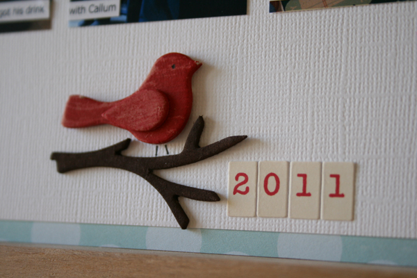 Used a cute little birdie from Maya Road which I painted and distressed, and a sweet butterfly from Jenni Bowlin. (Here's the rest of the supplies; Cardstock - Bazzill Basics, Patterned Paper - Basic Grey (spring trees) and Echo Park (spots), Chipboard bird - Maya Road, Number Stickers - October Afternoon, Butterfly and Number Flag Stickers - Jenni Bowlin, Chipboard Letters - Heidi Swapp, March Gaffer Tape - 7 Gypsies, Wednesday Stamp - Scenic Route, Paint - Making Memories).