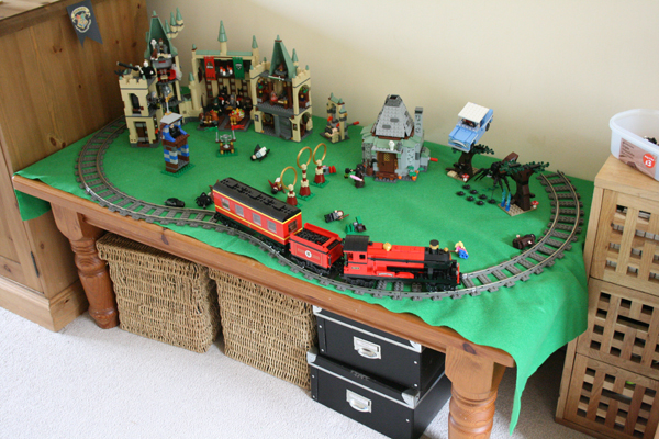 In the long room we I swapped the armchair and the coffee table around, put green felt over the table and the boys arranged their growing collection of Harry Potter lego kits onto it. Hogwarts Express and the two forbidden forests kits were new additions for Callum's birthday. See how Callum has lodged the Weasley's car into one tree which is now to be known as the 'whomping willow'!