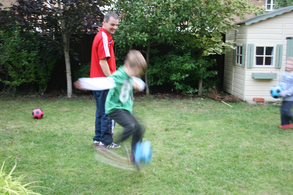 Jeff teaching the boys some football skills, hence the blur of legs. Callum kicks two balls out of the garden and I get one ball stuck in a tree!