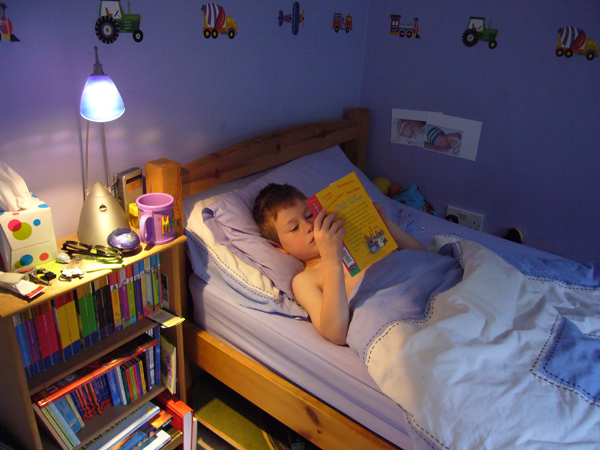 Matthew in bed reading yet another book, this time Charlie and the Chocolate Factory.