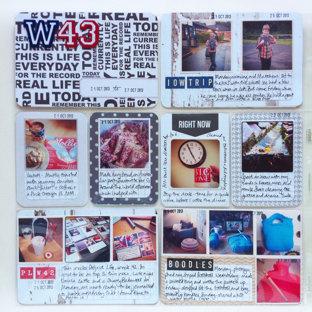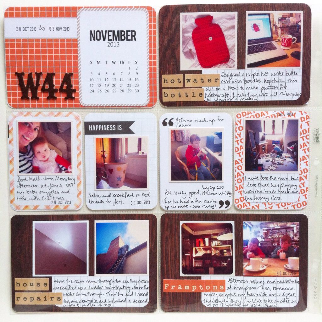 I've two weeks worth of Project Life to share, sometimes a week is busy that I can only find myself being able to grab half an hour here and there to work on it. This was the case with week 43. I always plan out what photos and stories I want to use with the help of the Momento App and a notepad and pencil. I love creating photo collages in Photoshop Elements to place in the 4x6 parts of the page protectors. It's my favourite way of including lots of photos from an particular day or event.
