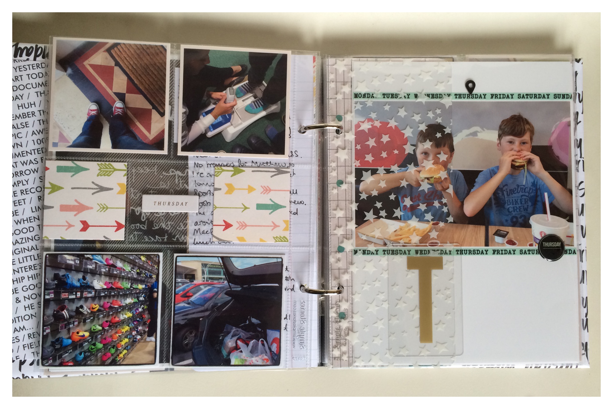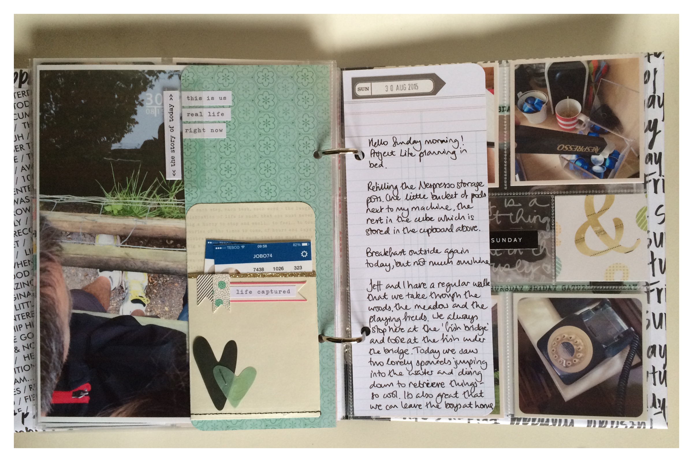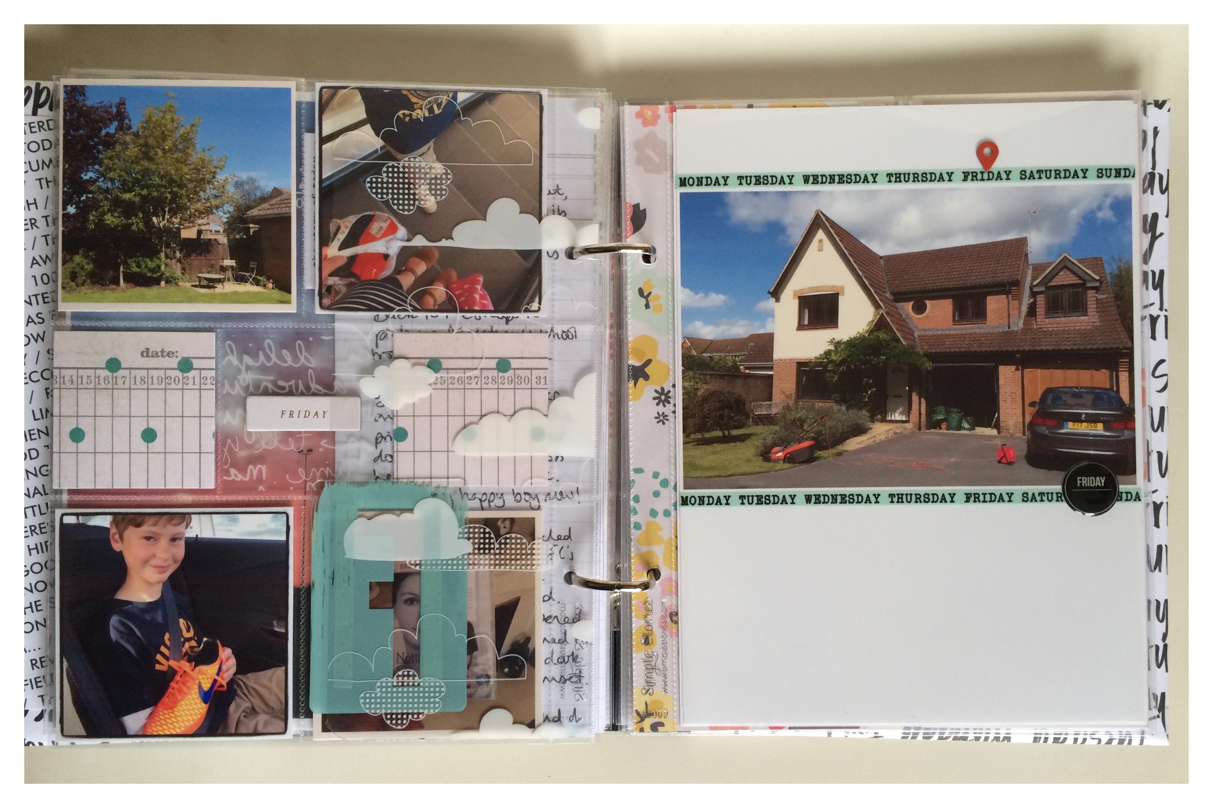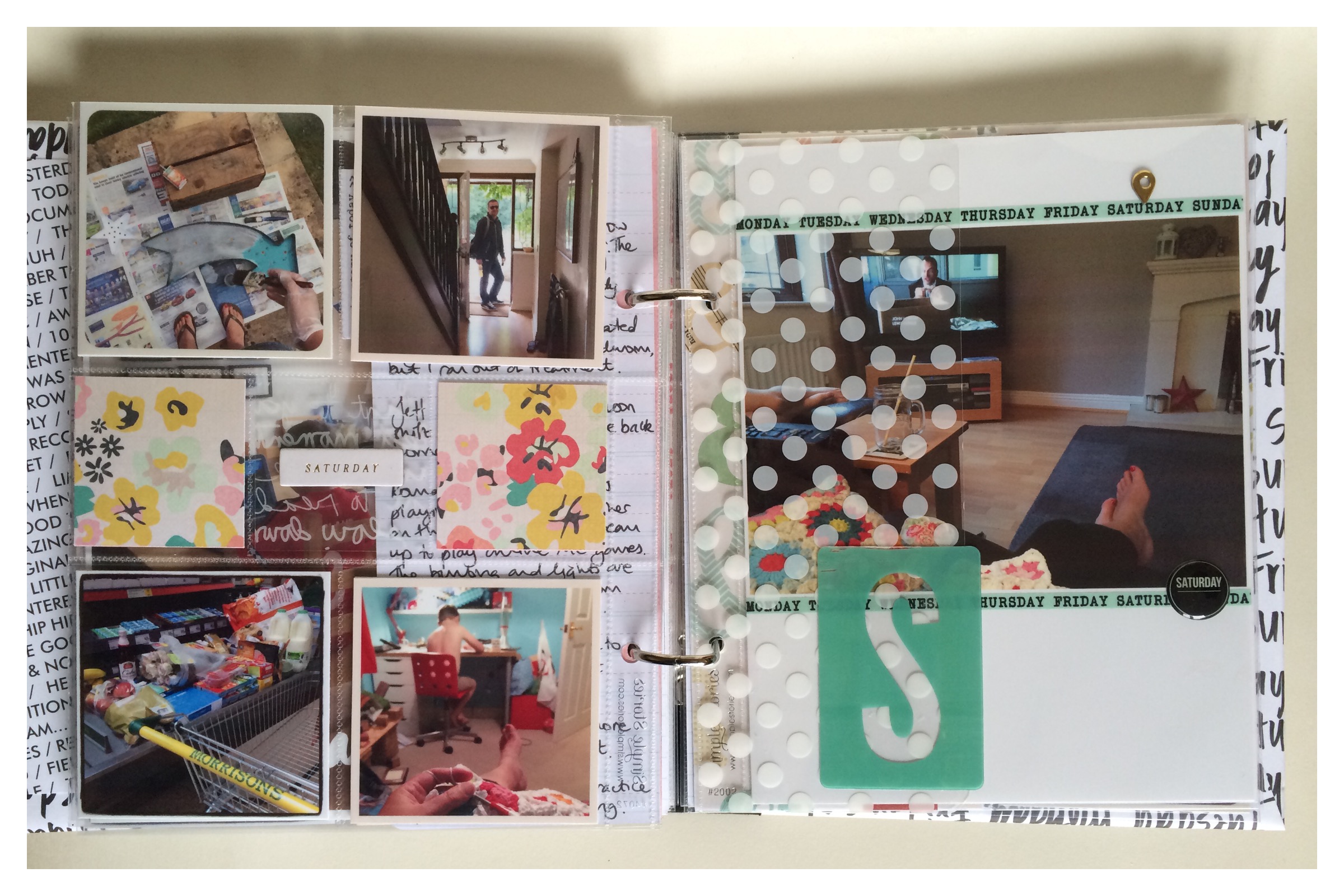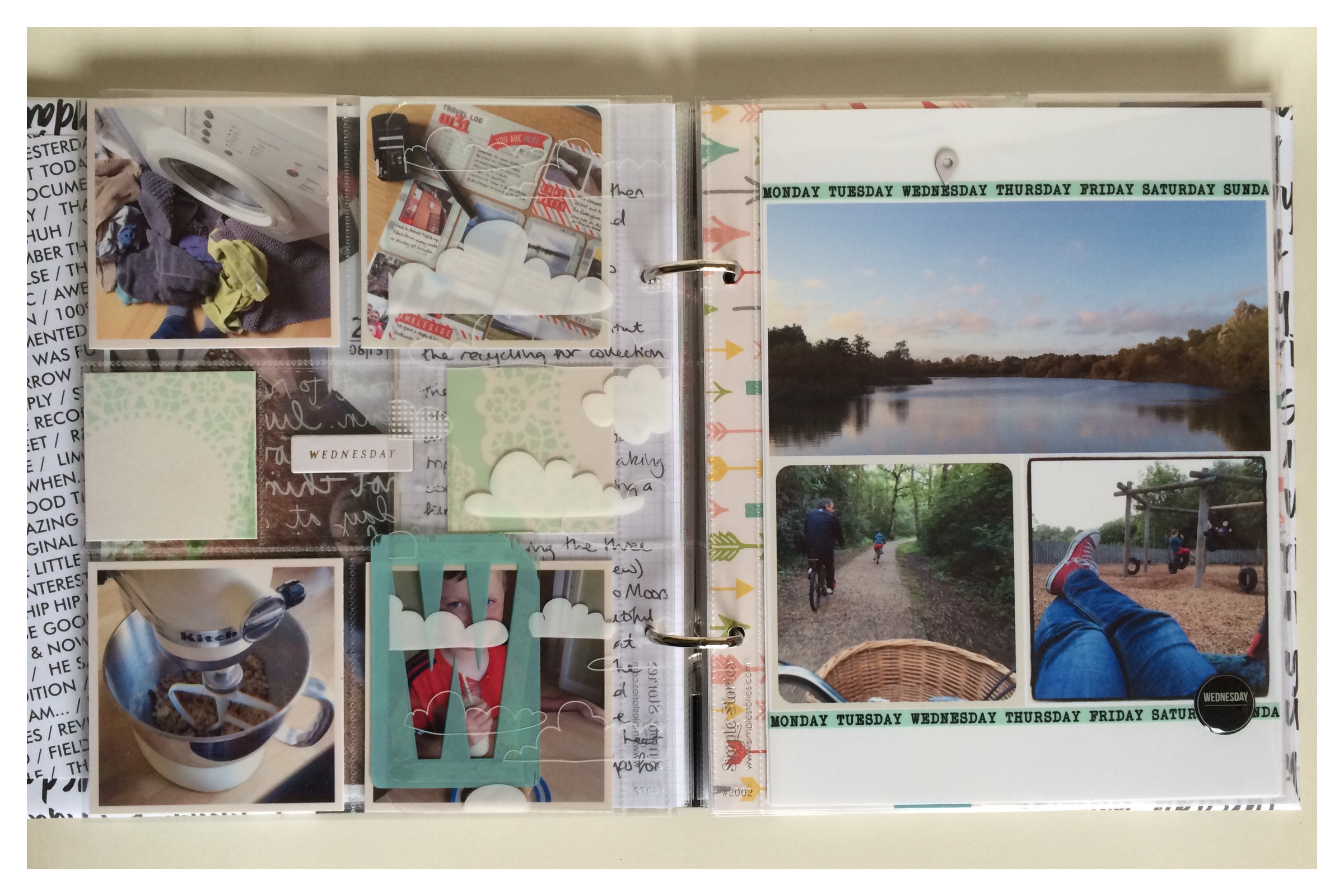I used a whole range of products; Album - Simple Stories Sn@p album. Patterned Paper - Maggie Holmes' 'Confetti' collection, Crate Paper's 'Poolside', Dear Lizzy 'Documentary' papers, October Afternoon and Pebbles. Transparencies - Hambly and WRMK. Embellishments - Heidi Swapp vellum hearts, Project Life 'Everyday' edition embellishments, Simple Stories days and word strips, Studio Calico washi tape and epoxy day stickers, Maggie Holmes pockets and acetate letters and finally little enamel hearts from Hey Little Magpie. Word Art and project concept by Ali Edwards. Phew, I think that's all of them!